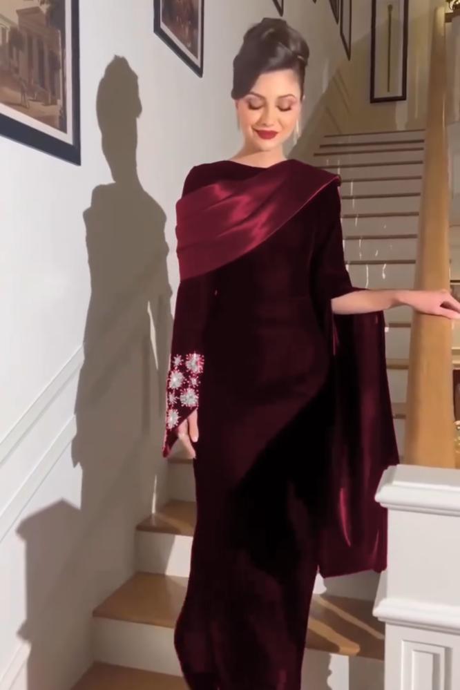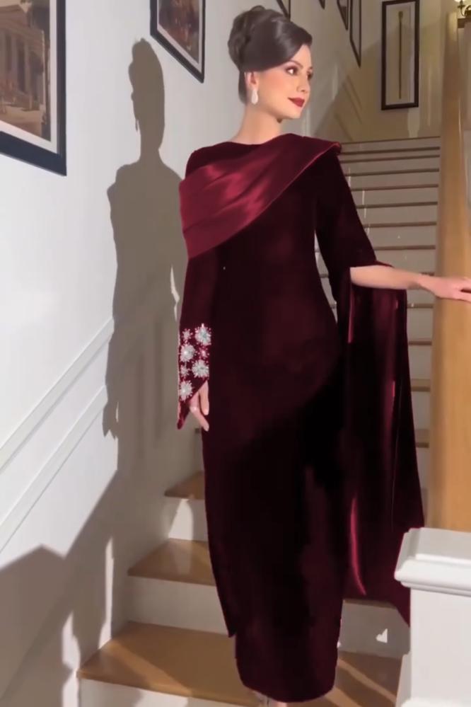 فستان الخامة مخمل كوري مع تفته الكم تطريز يدوي