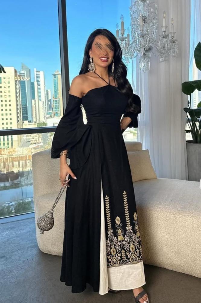 فستان بشكل جلابية خامة لينن اصلي تطريز كمبيوتر