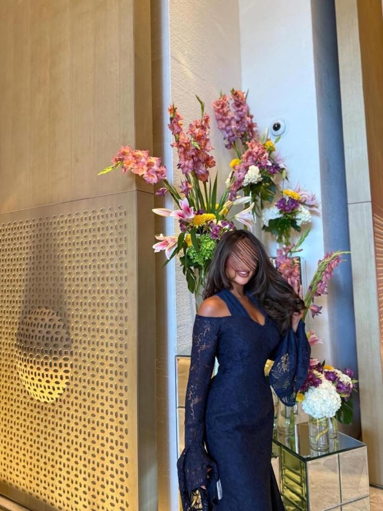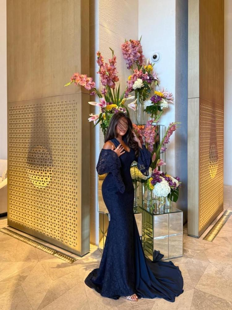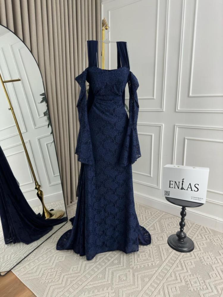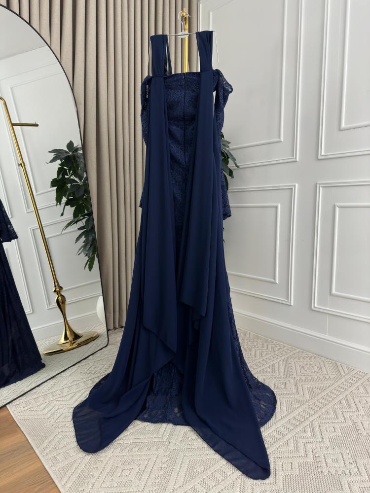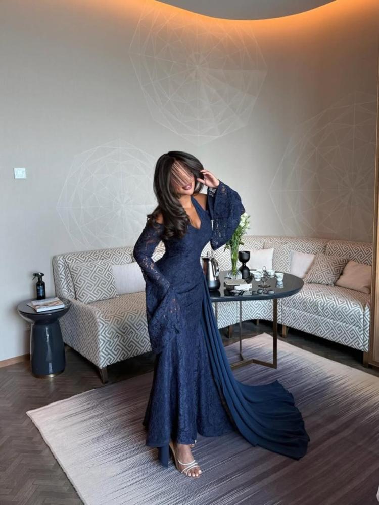 باختصار: فستان سهرة طويل من الدانتيل الكحلي بتصميم حورية البحر، يتميز بأكمام جرس طويلة وذيل/كاب متدلي من الخلف أو الكتف