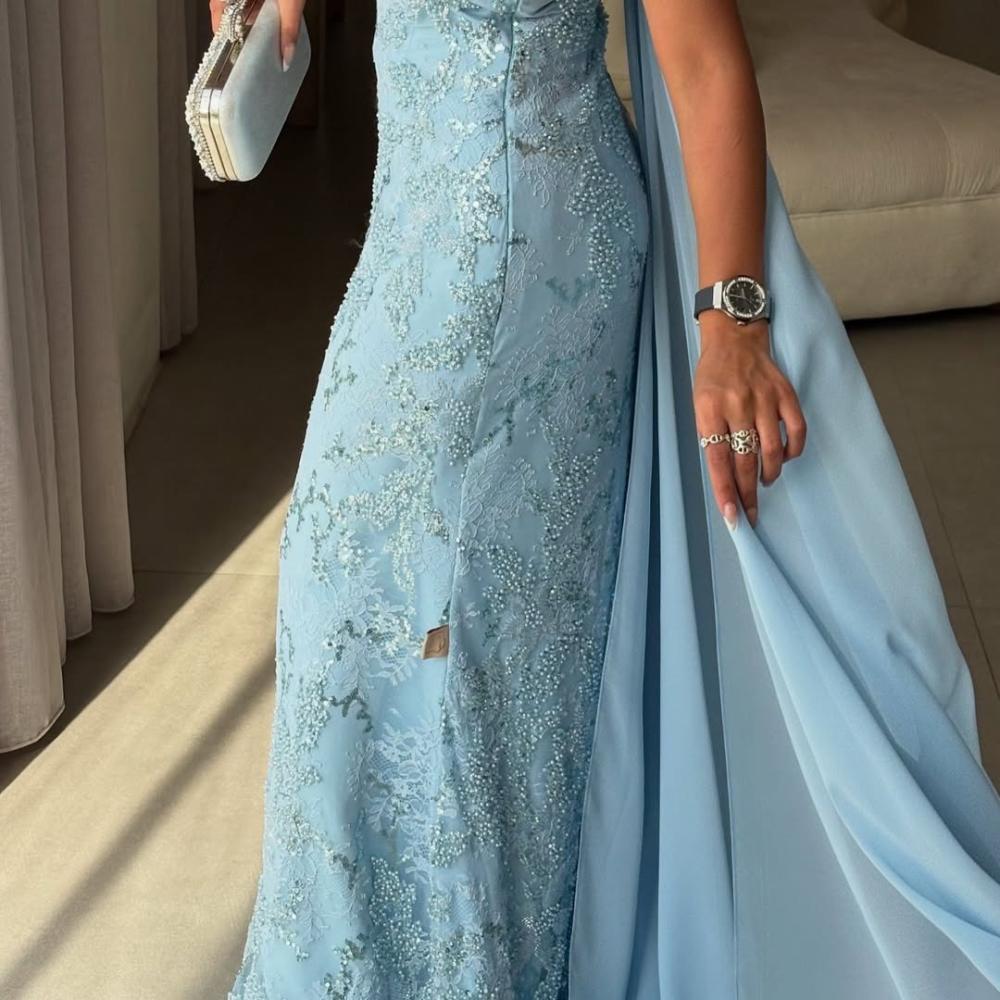 فستان راقي باللون الأزرق السماوي، بتصميم أنثوي أنيق مطرّز بتفاصيل ناعمة من الخرز والترتر اللامع، يضفي لمسة فاخرة على الإطلالة. يتميز بقصّة ضيّقة تُبرز جمال القوام مع شال منسدل من الخلف يضيف انسيابية ساحرة.