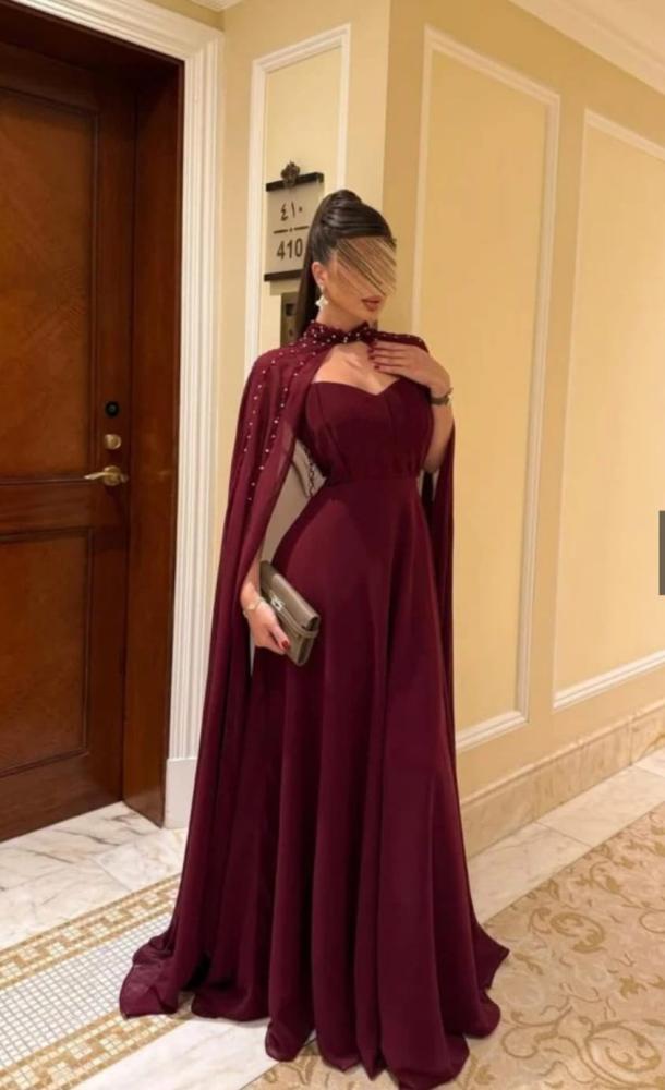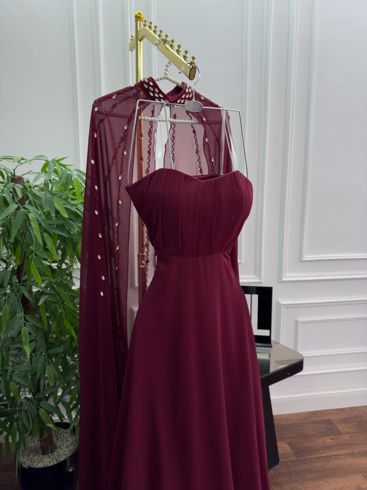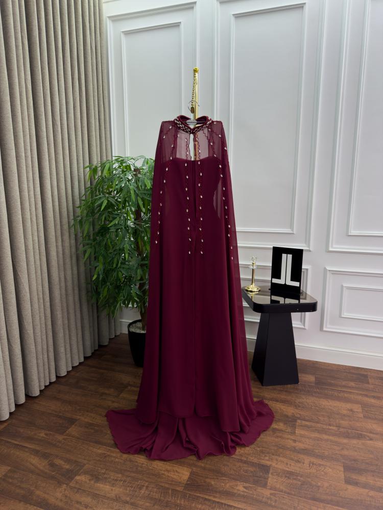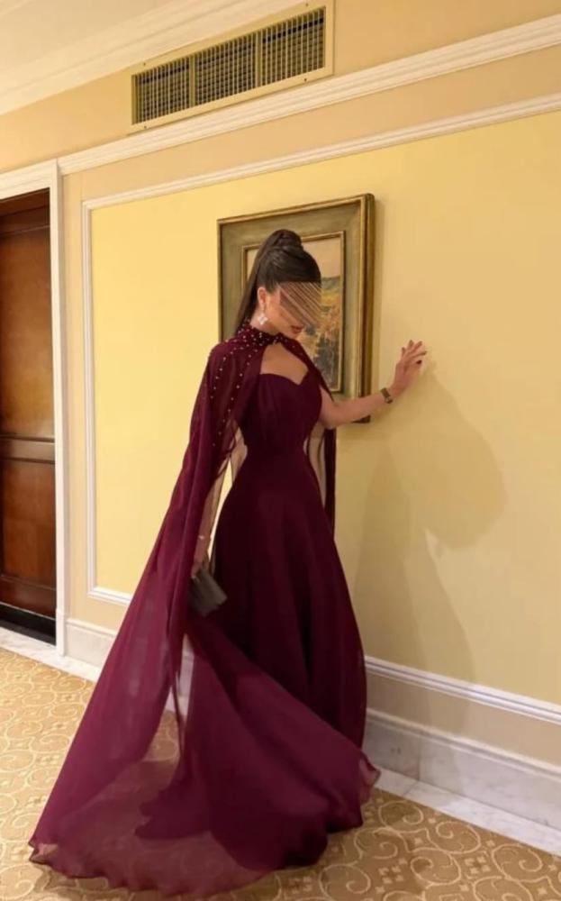 • يتميز الفستان بأكمام أو كاب منفصل (من المحتمل أنه يمكن إزالته) مصنوع من طبقات كبيرة ومنفوشة من قماش الأورجانزا أو التول بنفس اللون البنفسجي. هذه الأكمام المنفوشة تضيف لمسة درامية وعصرية للتصميم